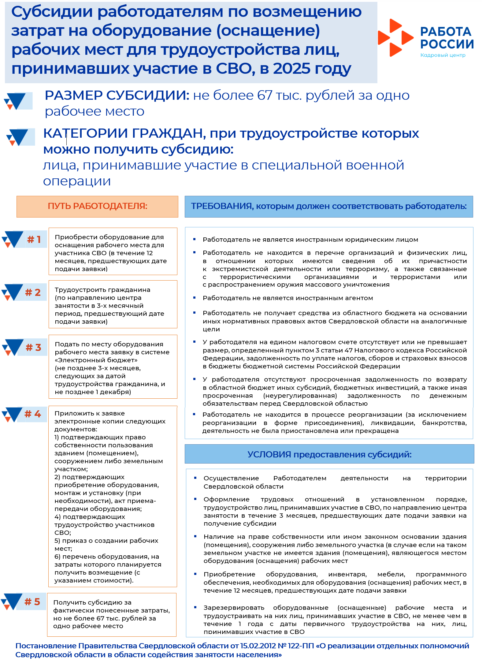 Субсидии работодателям по возмещению затрат на оборудование (оснащение) рабочих мест для трудоустройства лиц, принимавших участие в СВО, в 2025 году