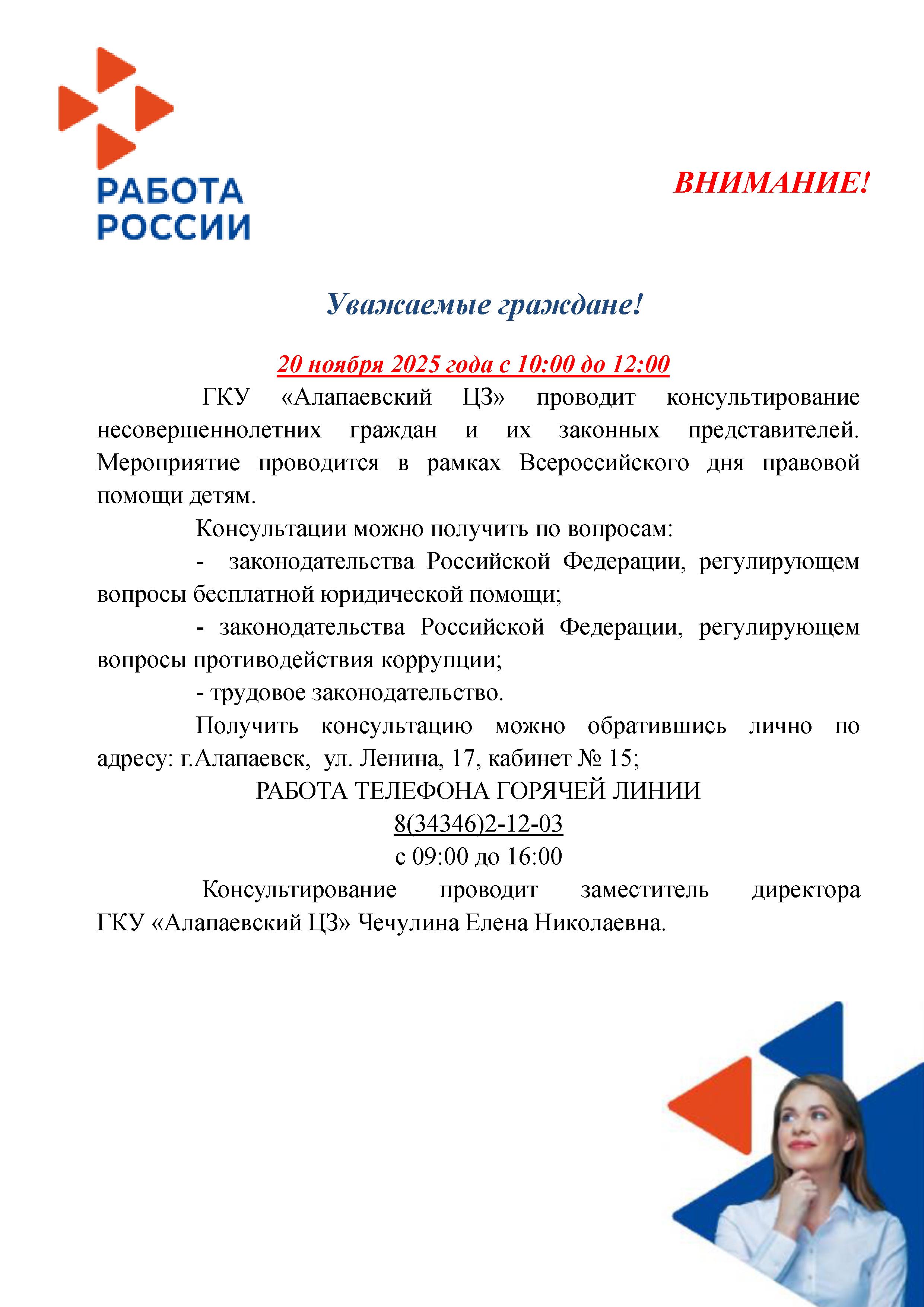 20 ноября 2025 года с 10:00 до 12:00 ГКУ «Алапаевский ЦЗ» проводит консультирование несовершеннолетних граждан и их законных представителей