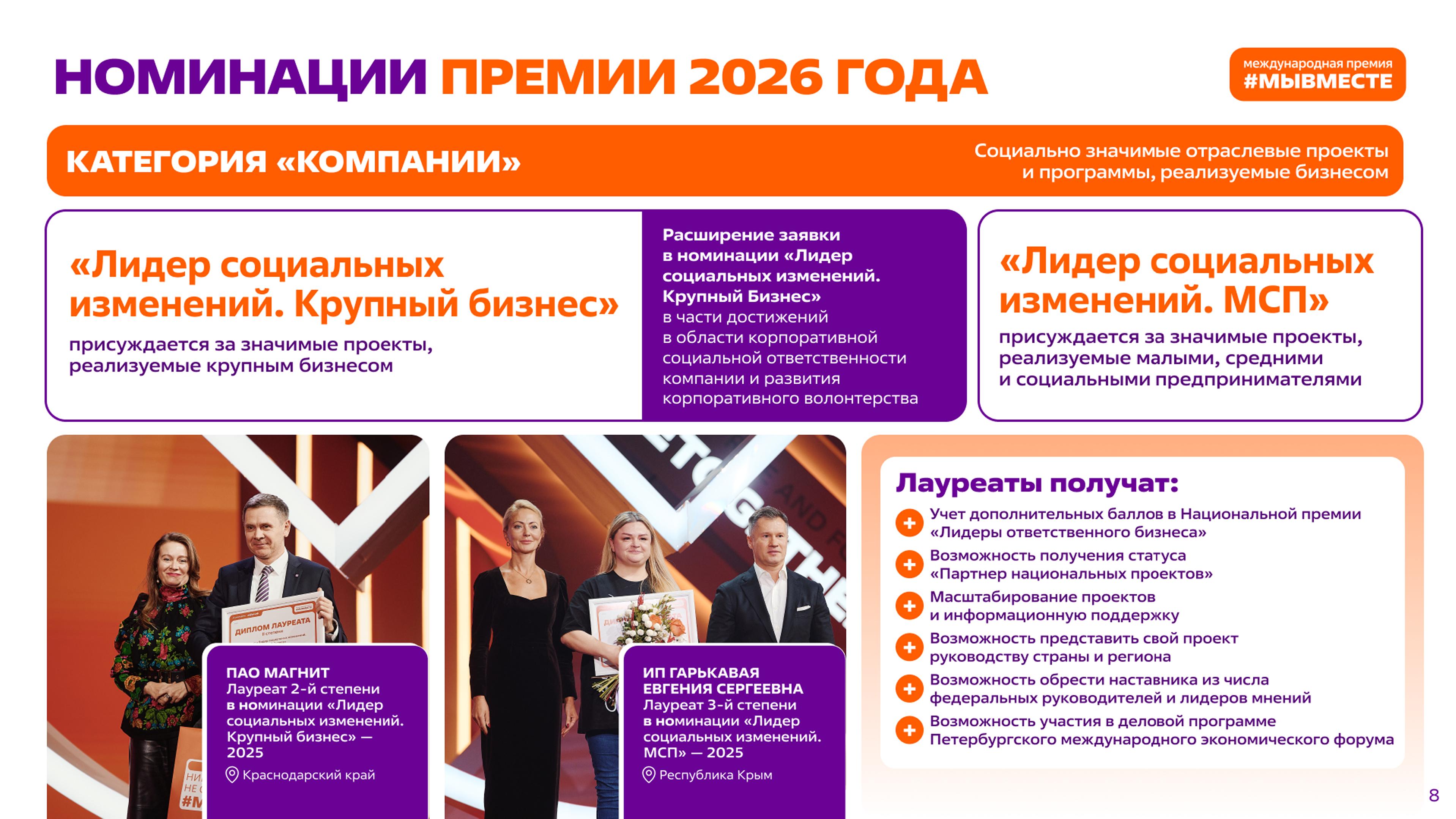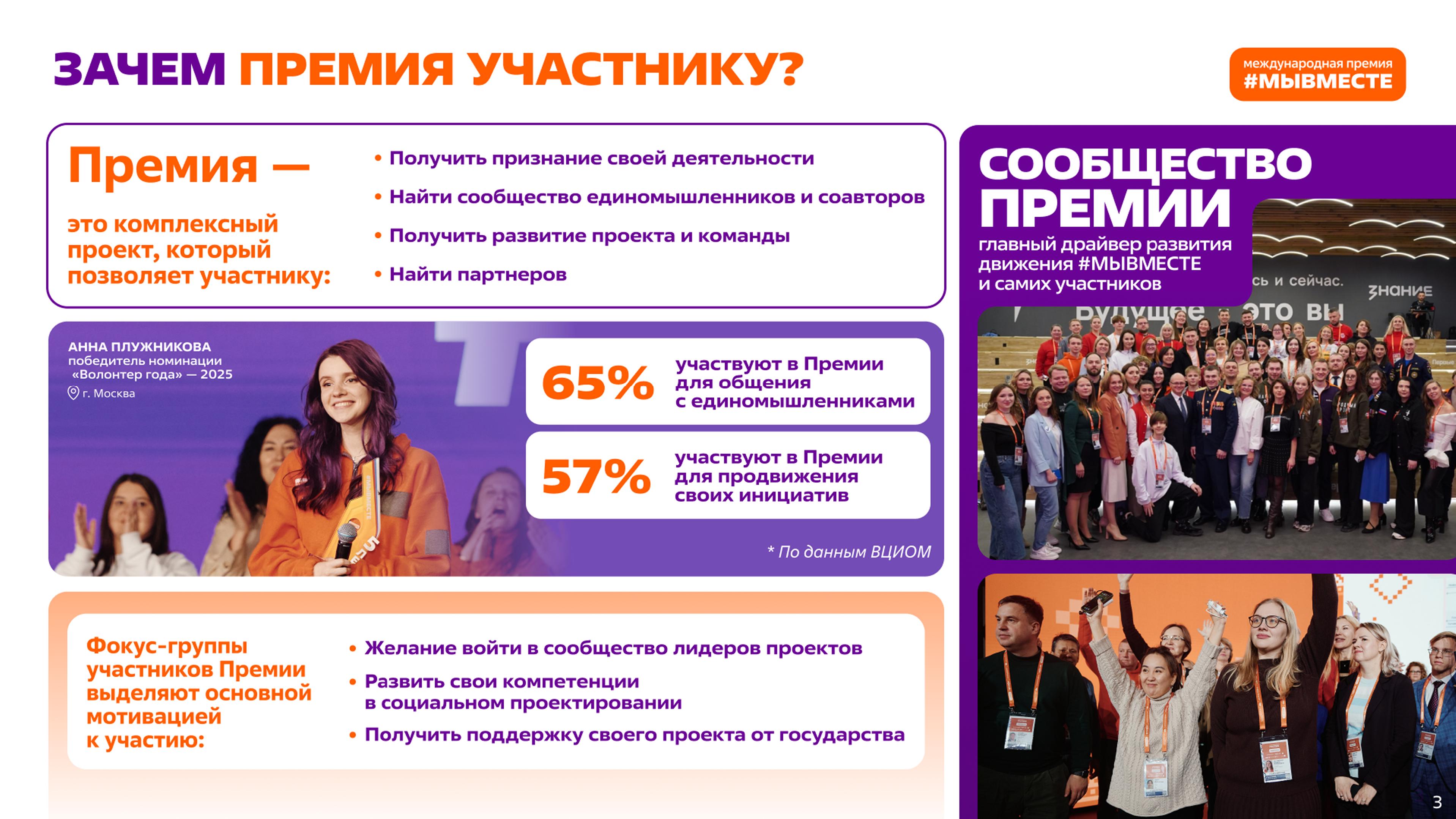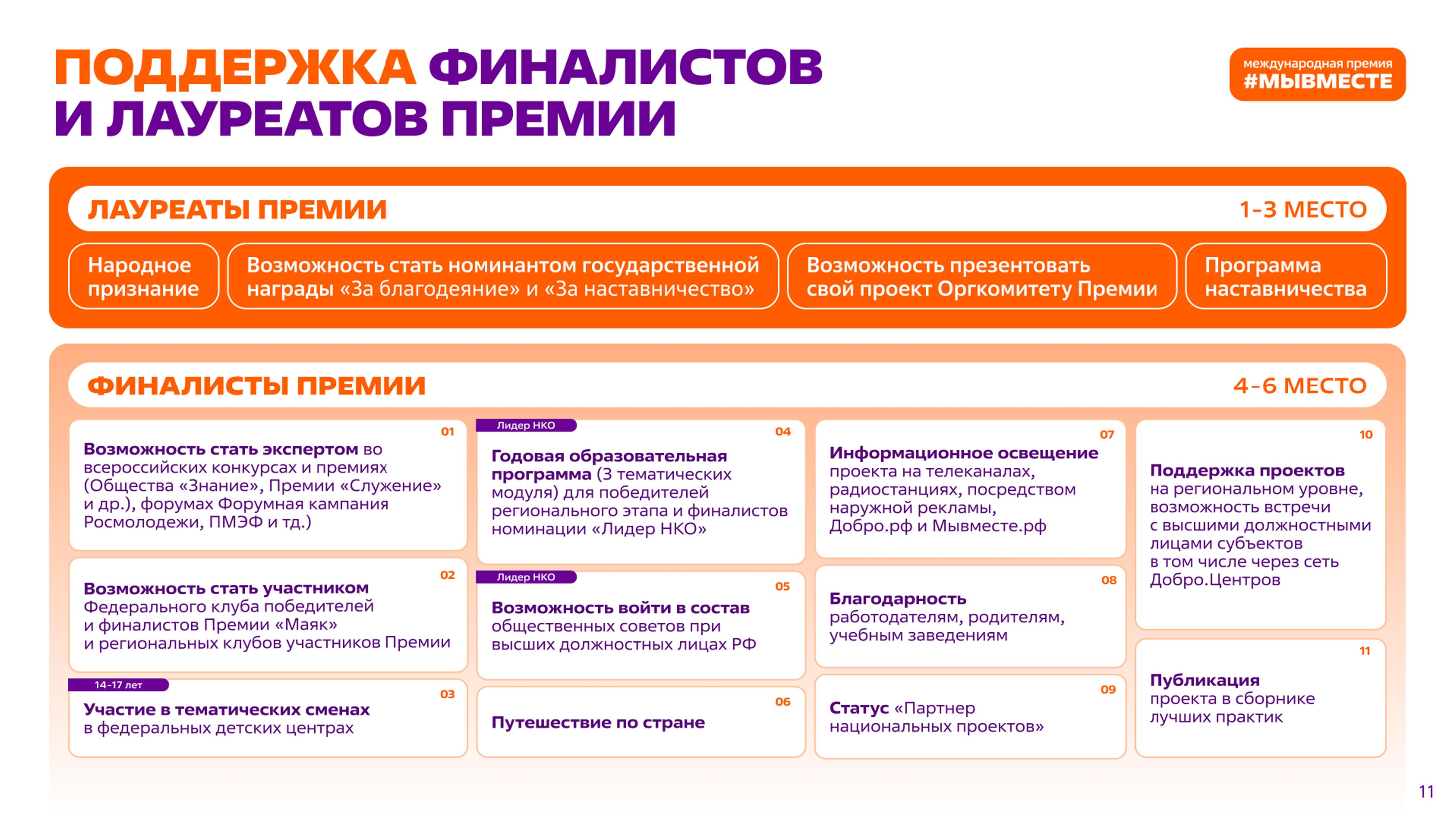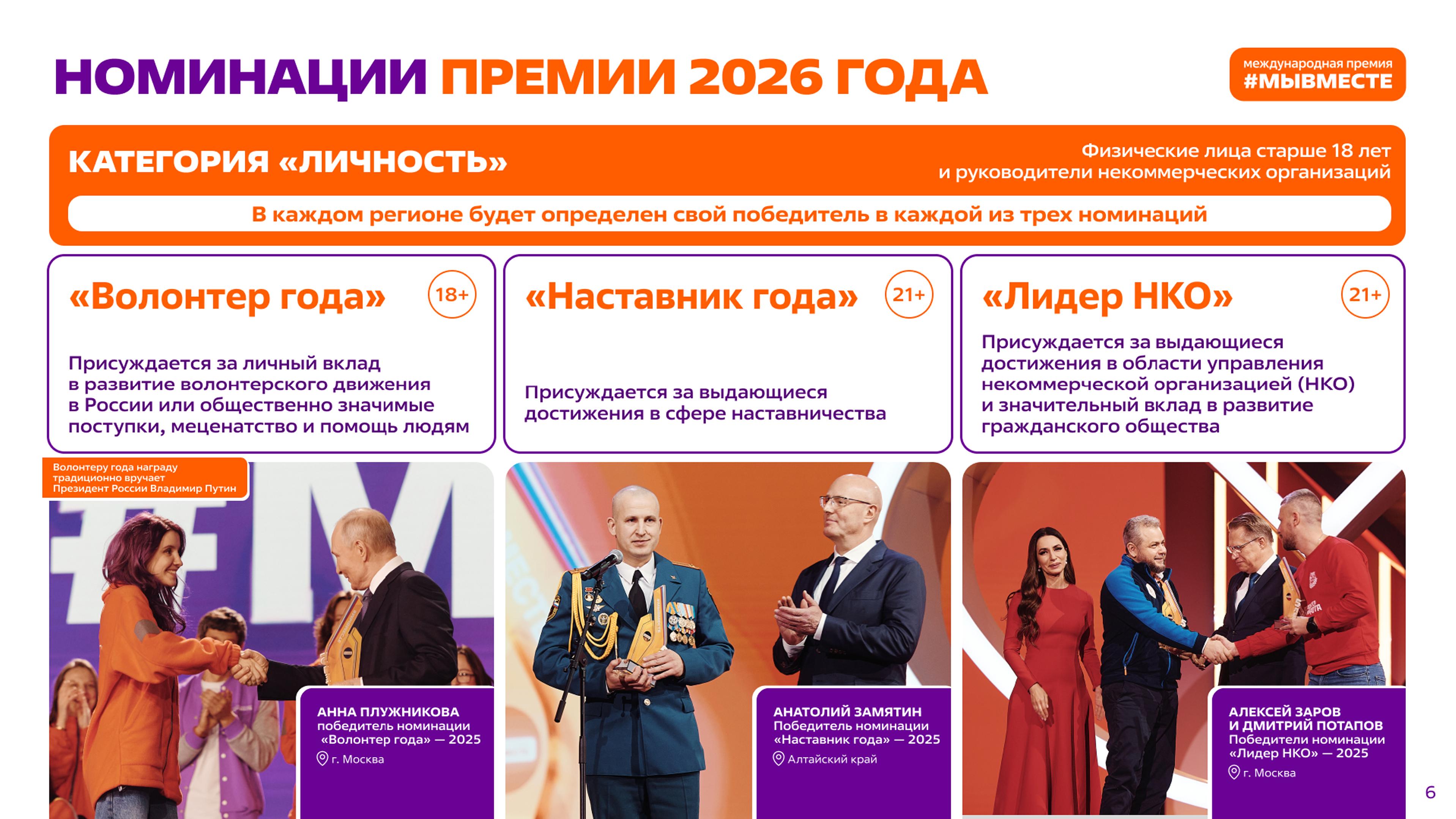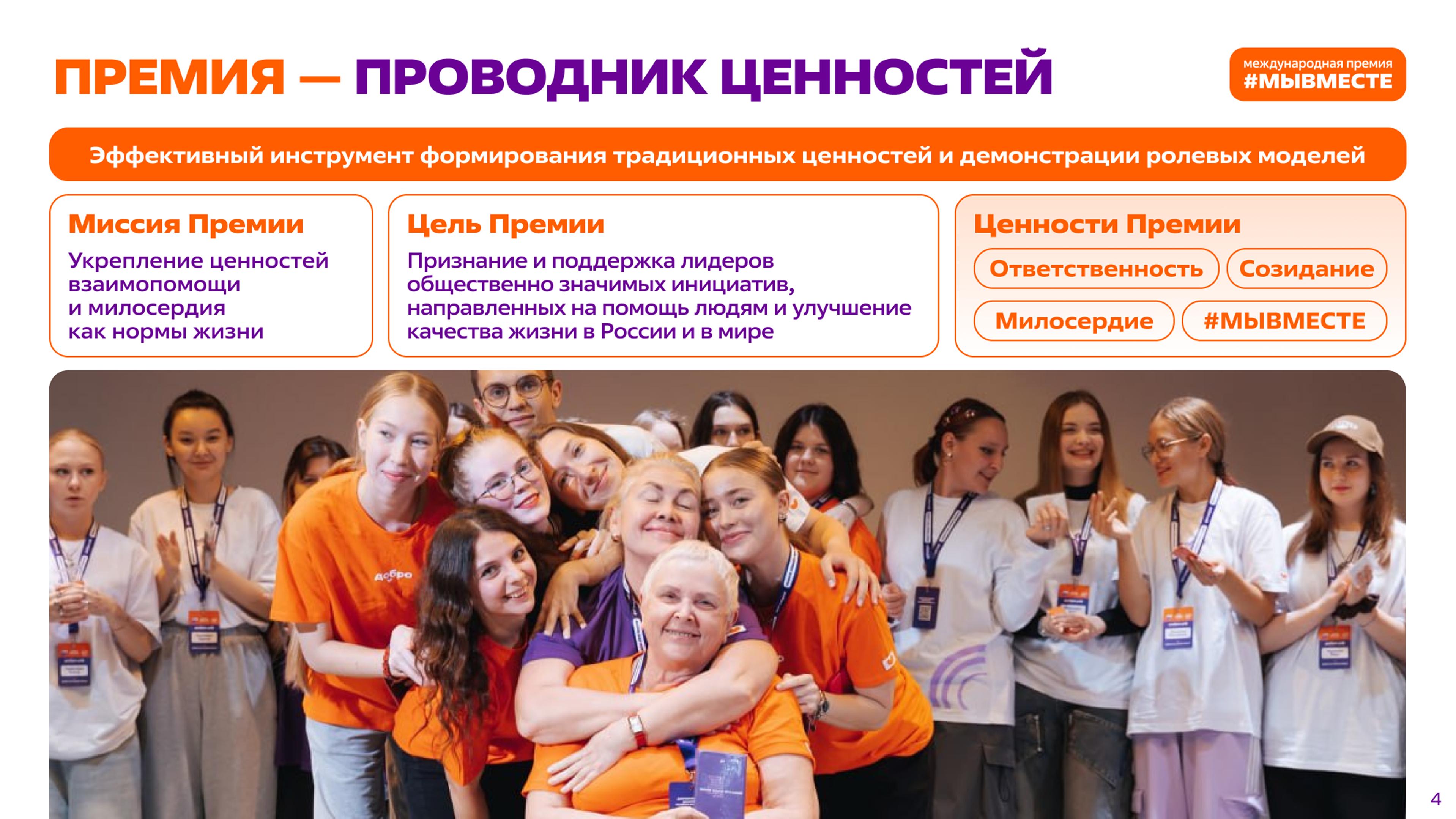 Во исполнение пункта 3 поручения Президента Российской Федерации от 23 июля 2020 г.№ Пр-1150 по итогам встречи с участниками акции «МыВместе» с 2021 года в Российской Федерации проходит вручение Международной Премии #МЫВМЕСТЕ.