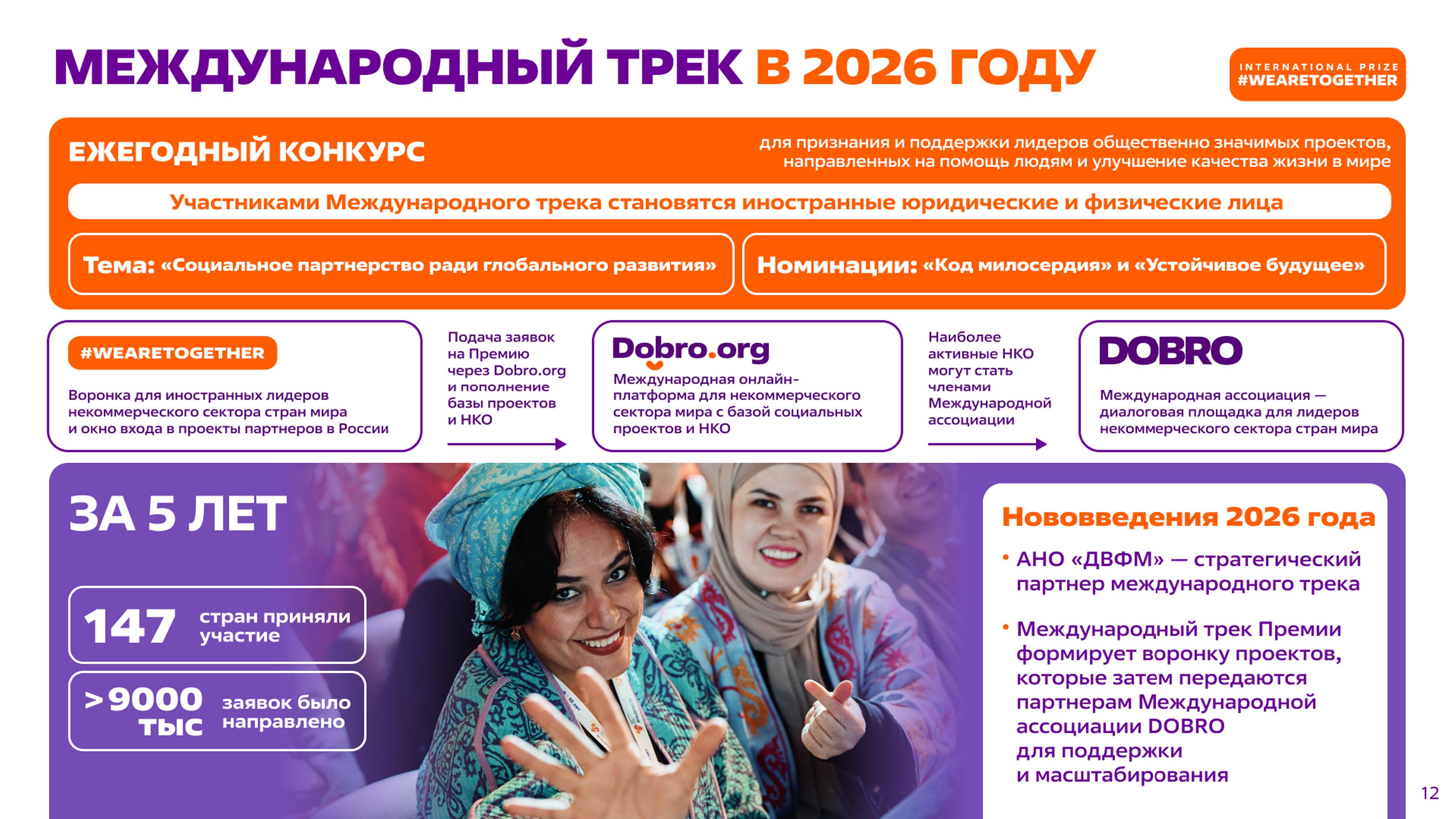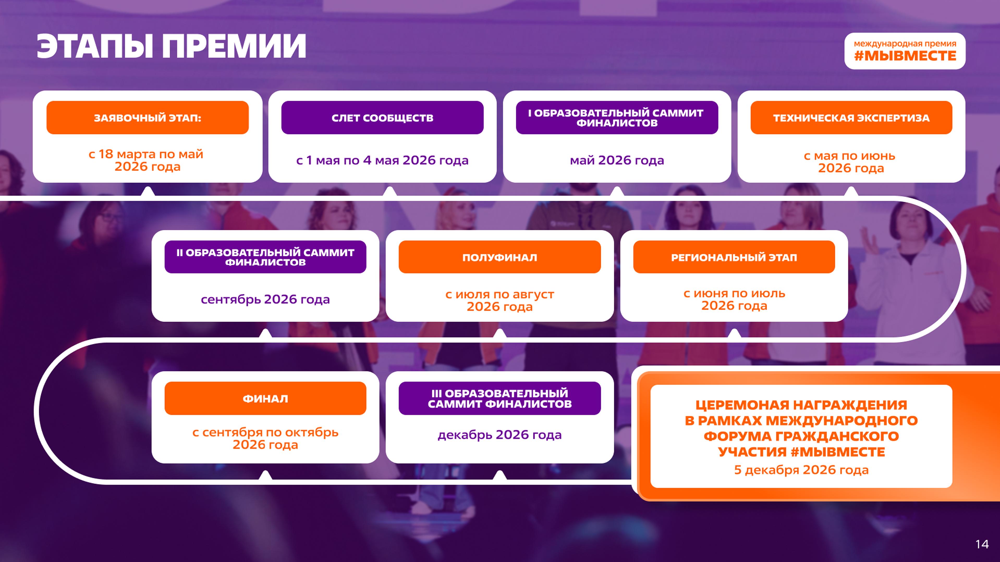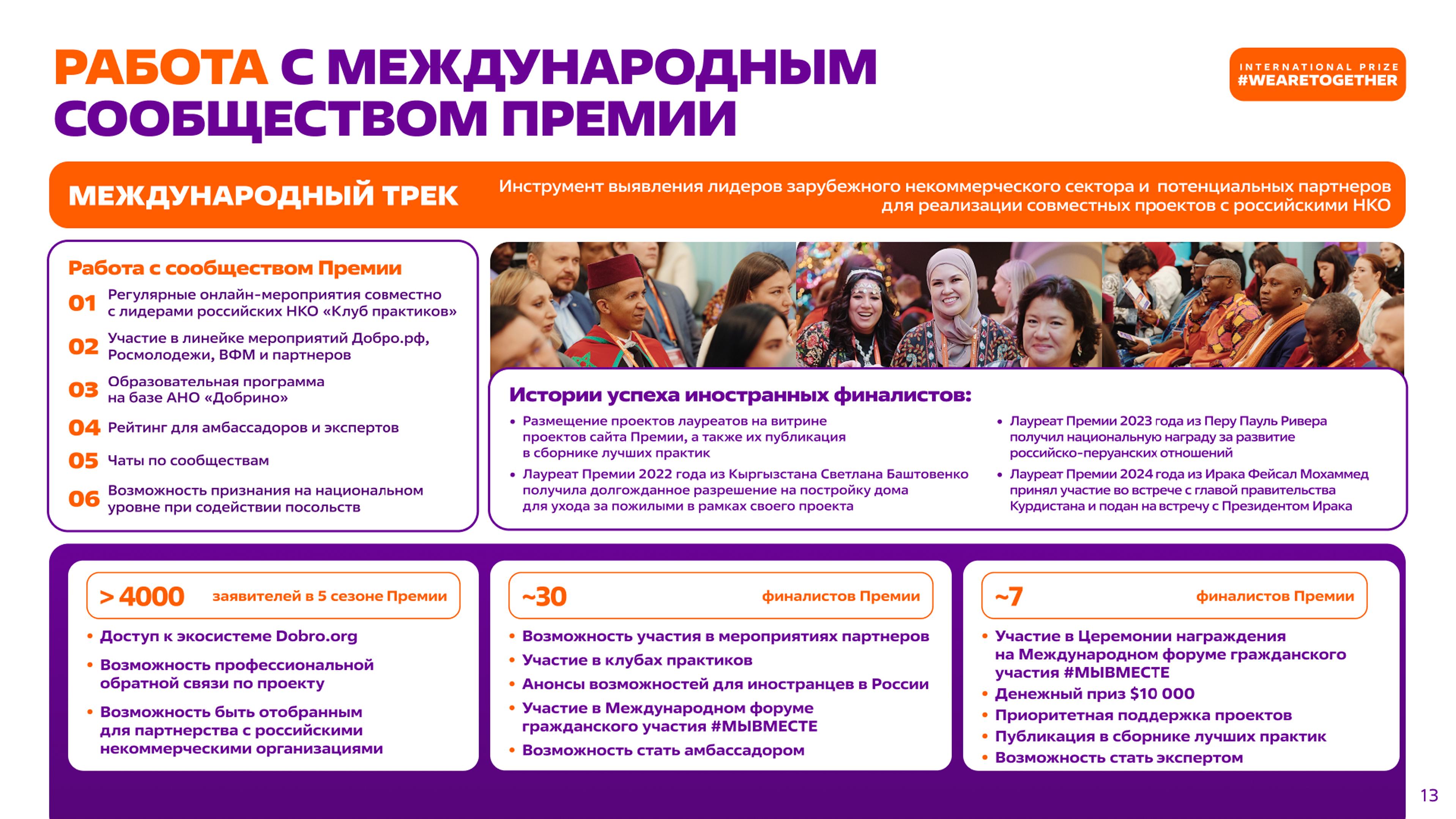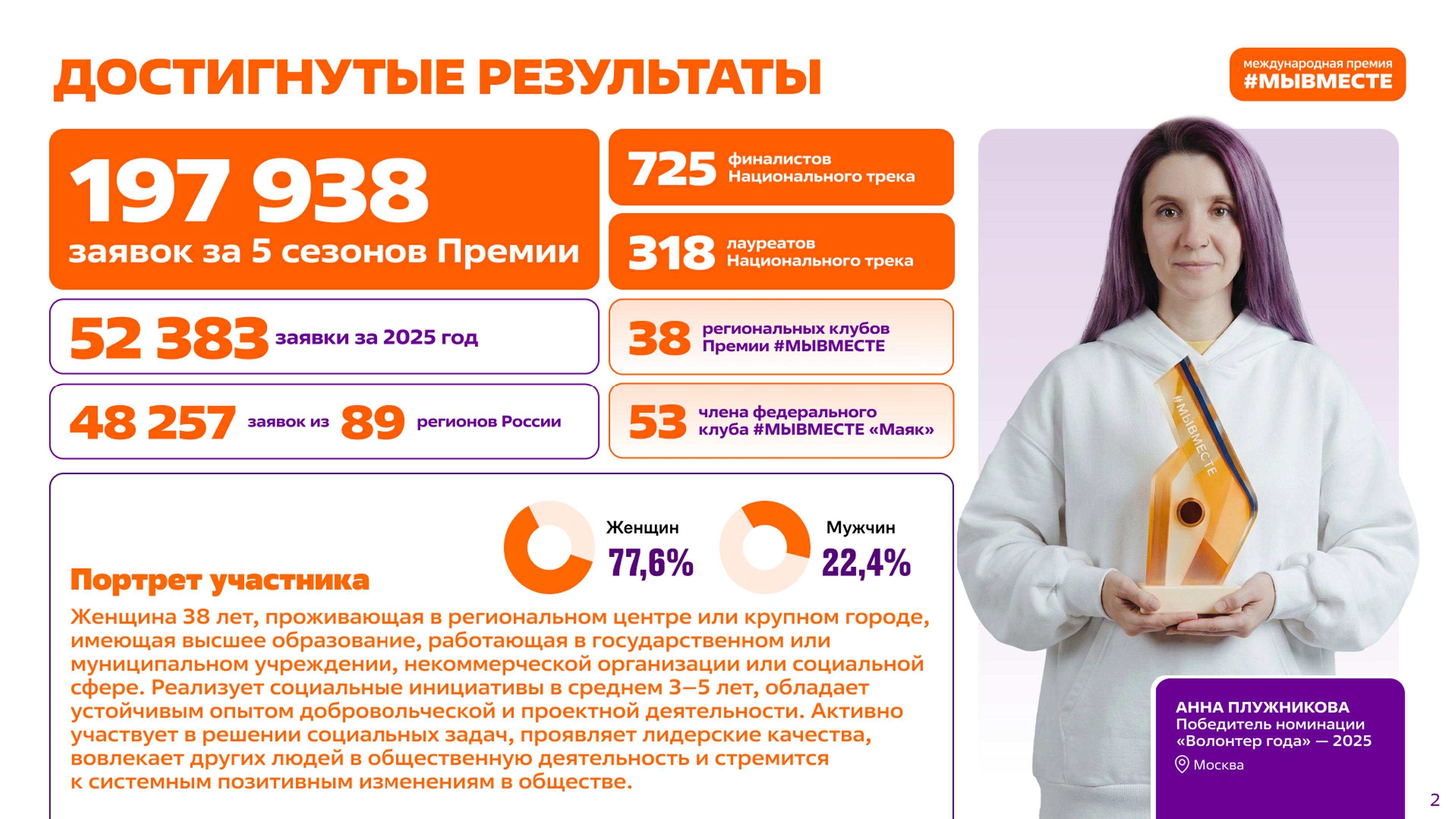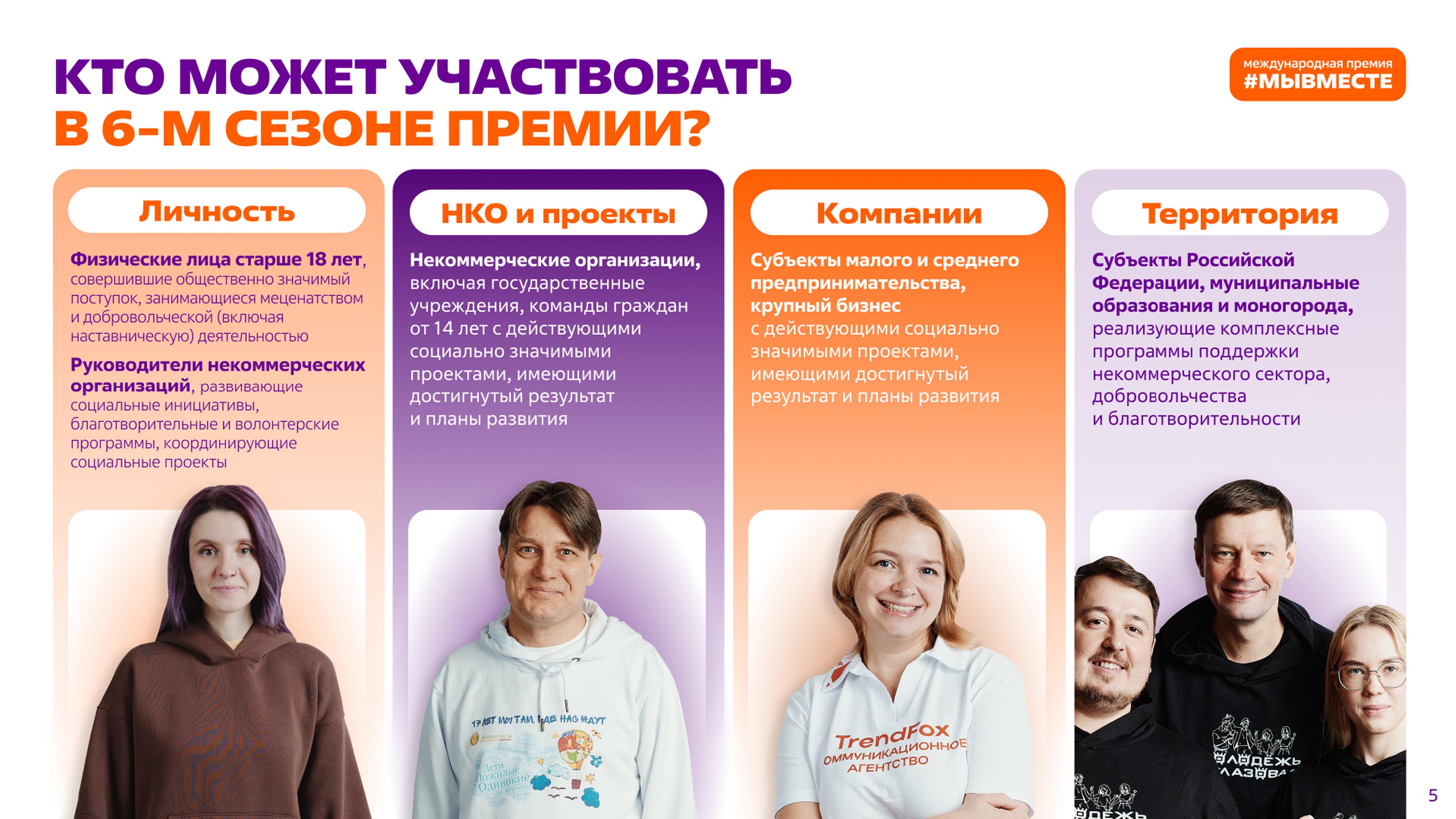 Во исполнение пункта 3 поручения Президента Российской Федерации от 23 июля 2020 г.№ Пр-1150 по итогам встречи с участниками акции «МыВместе» с 2021 года в Российской Федерации проходит вручение Международной Премии #МЫВМЕСТЕ.