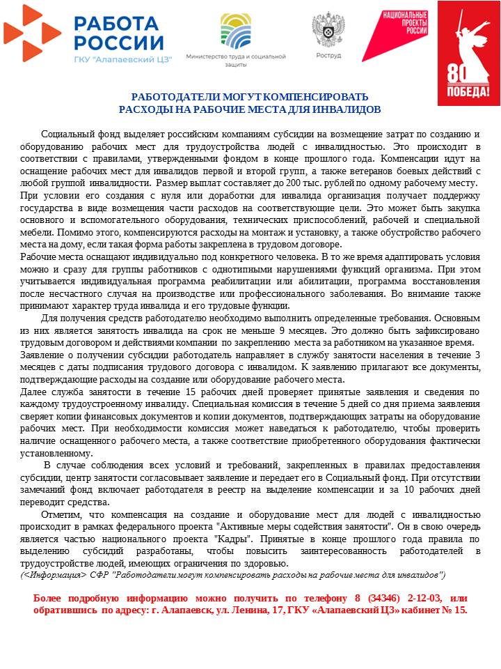 РАБОТОДАТЕЛИ МОГУТ КОМПЕНСИРОВАТЬ РАСХОДЫ НА РАБОЧИЕ МЕСТА ДЛЯ ИНВАЛИДОВ